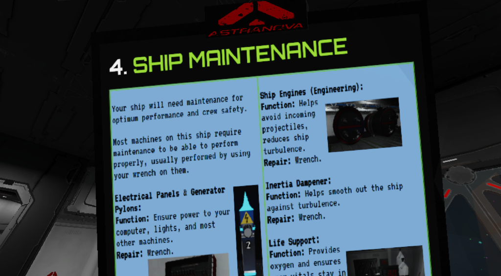 I recently added a tablet that contains information for maintaining / repairing the ship. Initially I had created a separate tab on the in-game computer that contained this information – but I felt the computer UI was getting quite cluttered so I thought it was a good opportunity to pull all that out of the computer and into a handy tablet any crew member can reference. After you grab it you’re able to zoom into the tablet to read the contents easily.